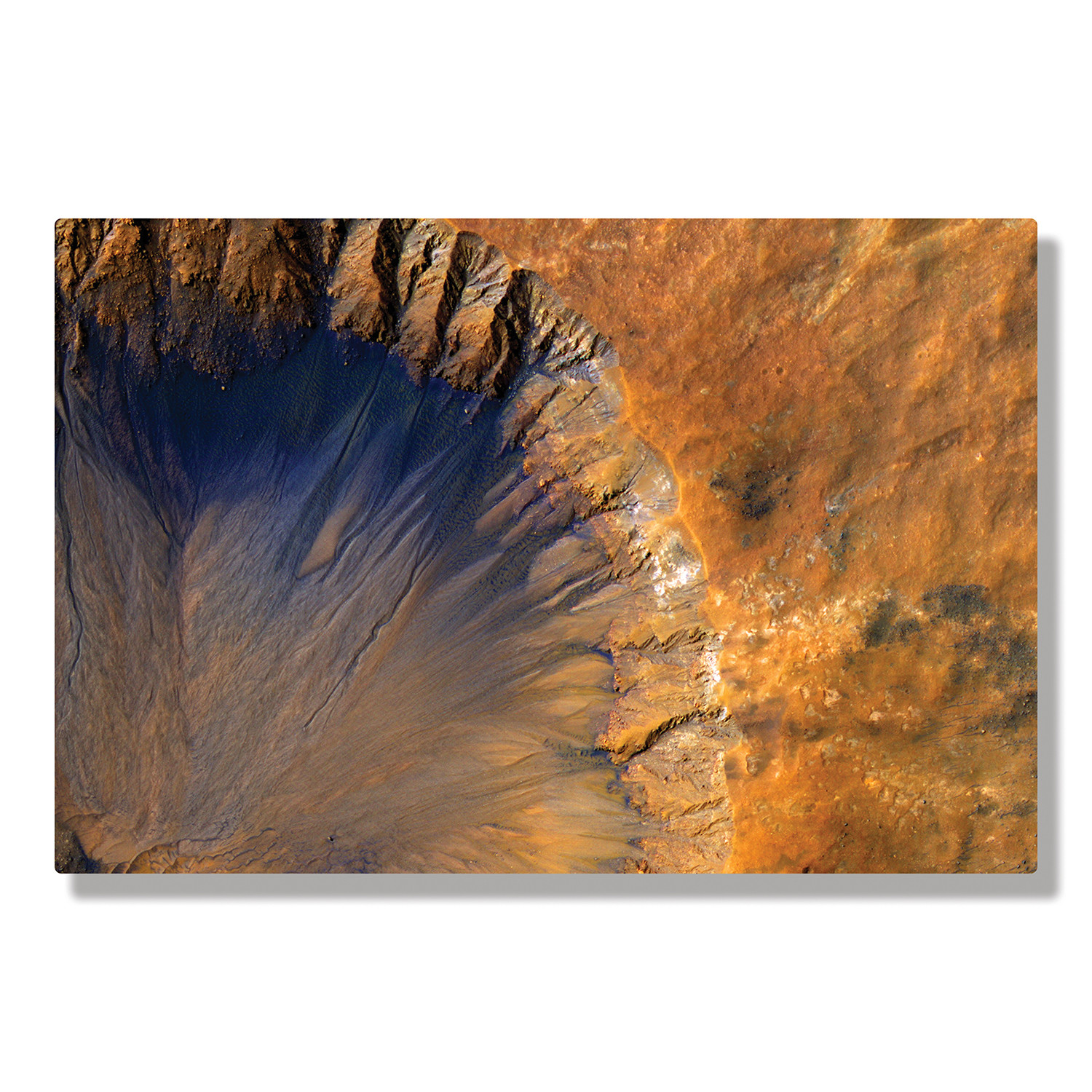 Enjoy the beauty and wonder of a new planet with this high-gloss aluminum Mars print. Each piece comes with an engraved panel on the back that describes details of the image being portrayed, including the exact coordinates, local mars time at the moment of capture, and the instrument used. Add it to your space for an otherworldly touch.