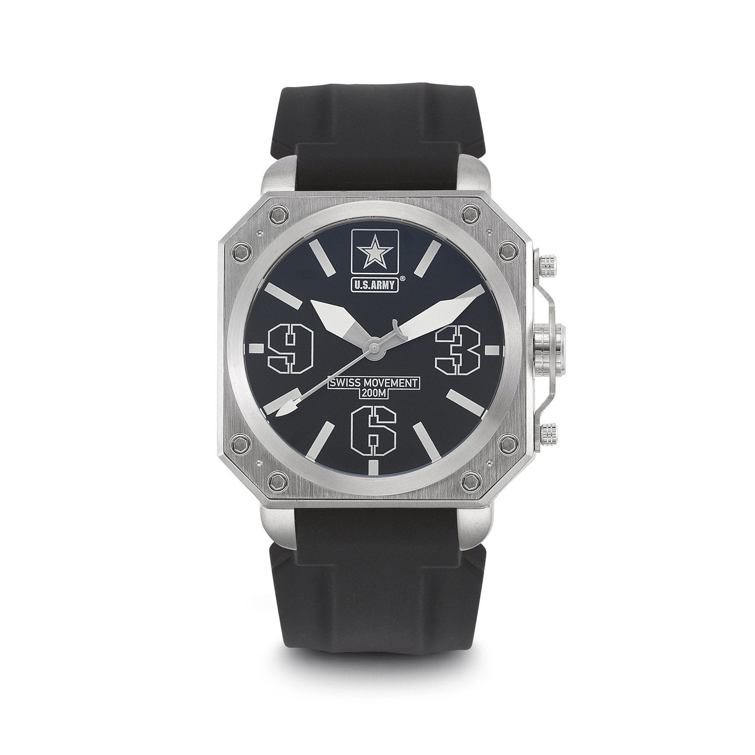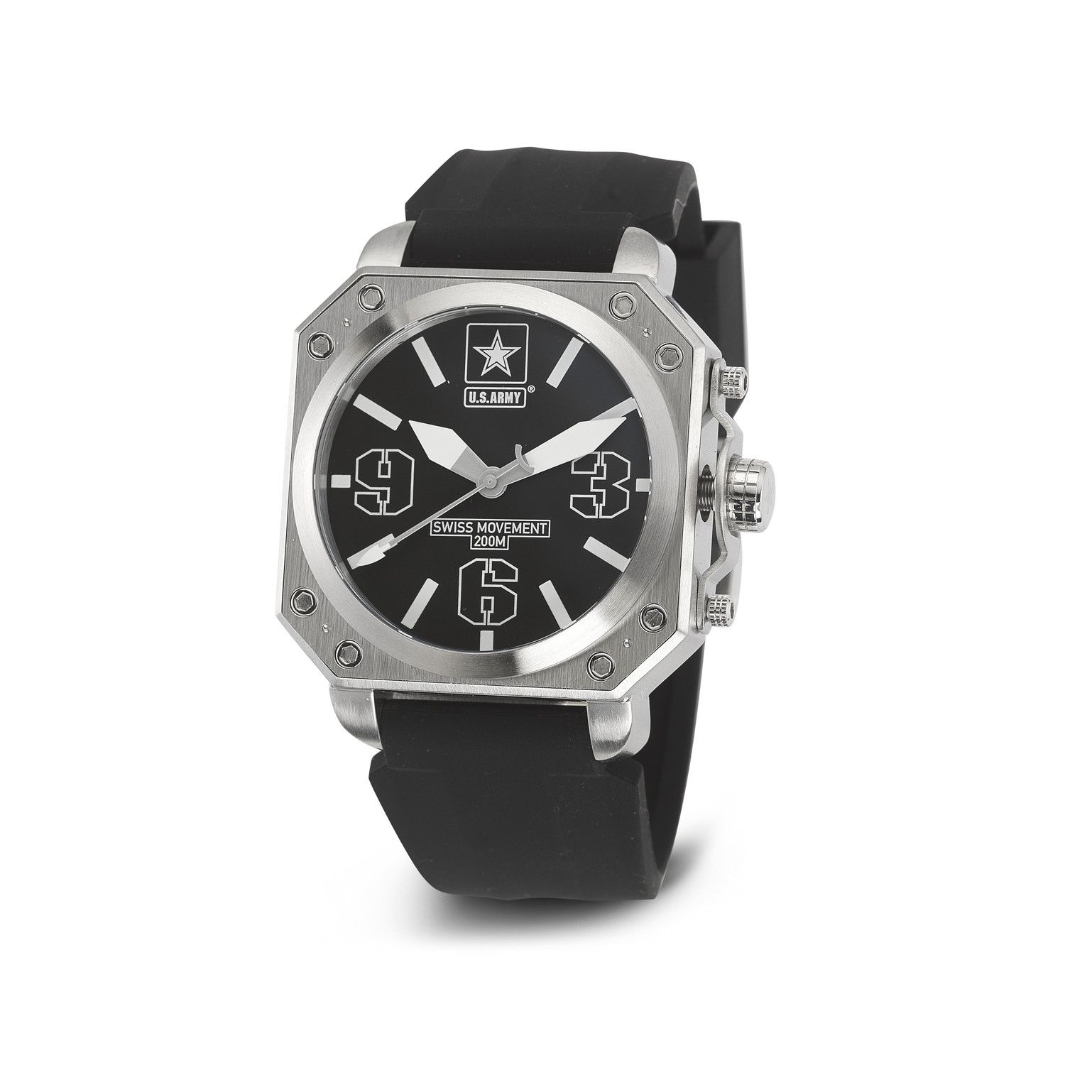 The United States Army Stainless Steel Swiss Quartz Watch features a 45.5mm wide and 14mm thick solid stainless steel case with a fixed bezel and a textured screw-down crown. This watch is powered by a precision Swiss quartz movement, and features scratch resistant K1 shatterproof mineral crystal, as well as a water resistance of 200 meters. Wear it and you'll be ready to greet the day the way only an adventurer can.
