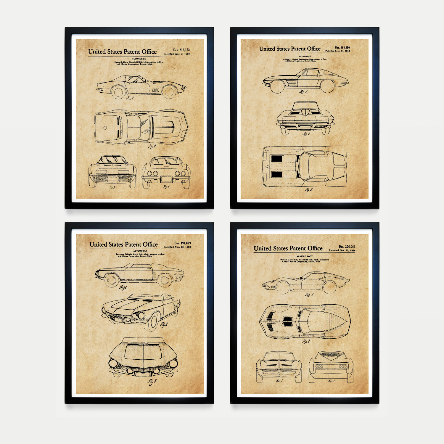 Corvette Patent Collection // 4 Print Set // Antique Paper