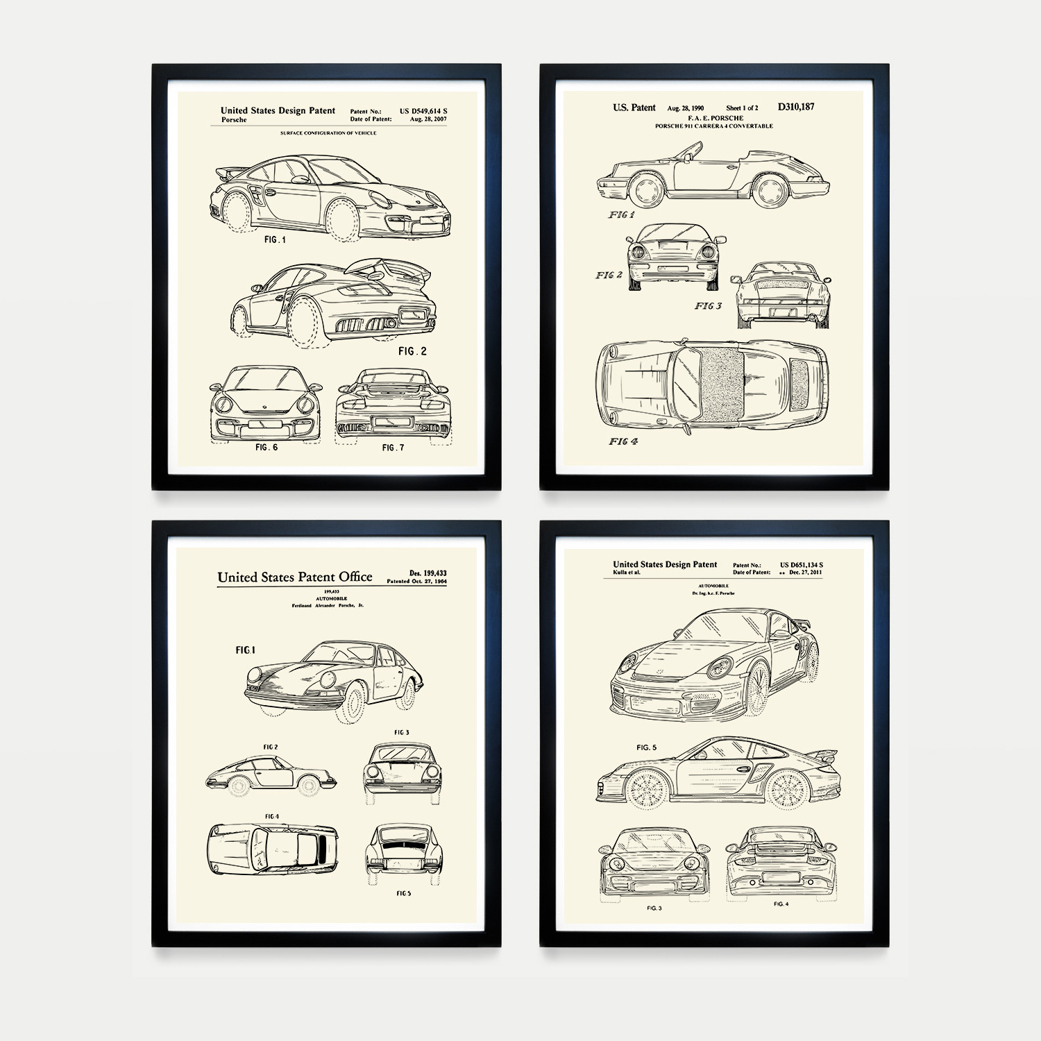 This set of 4 Porsche Patents make the perfect decor for any home or office. Done on heavyweight matte paper with archival pigment, you can set these pieces in dynamic, grouped arrangements or spread them throughout your home.