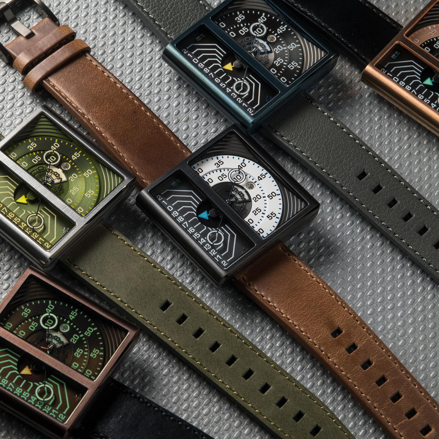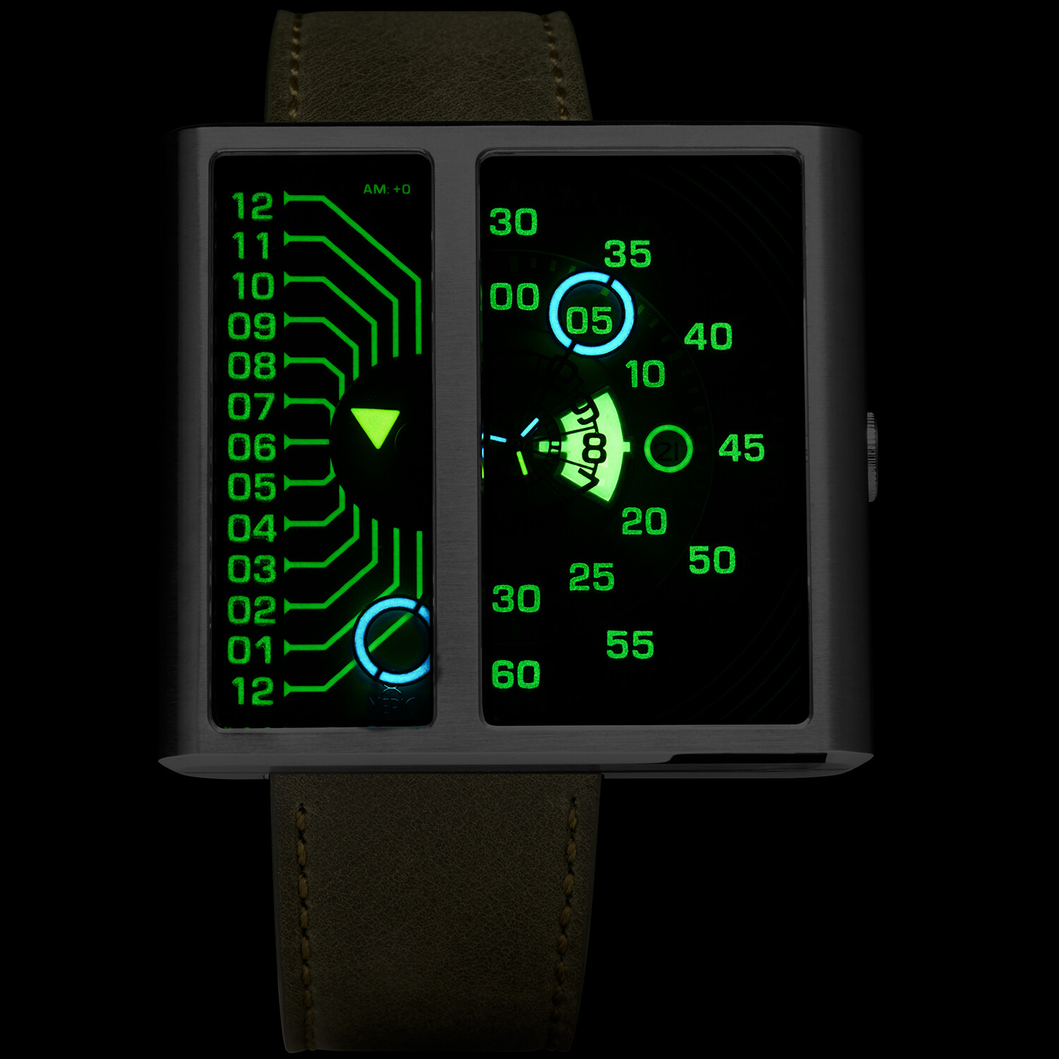 The Soloscope II Automatic has been completely redesigned and upgraded from the original. Powered by the venerable Miyota 8217 automatic movement with date function, a 40 hour power reserve, and a custom-designed rotor that can be seen through the case back. A skeletonized hour hand comes into view as it rotates over a luminous background while the halo hand encircles the minutes. The left-hand side of the watch is an AM/PM indicator and can alternatively be used to read the hours. The new case design features a slimmer profile with a colorful anodized aluminum ring, integrated lugs, and anti-reflective sapphire glass.