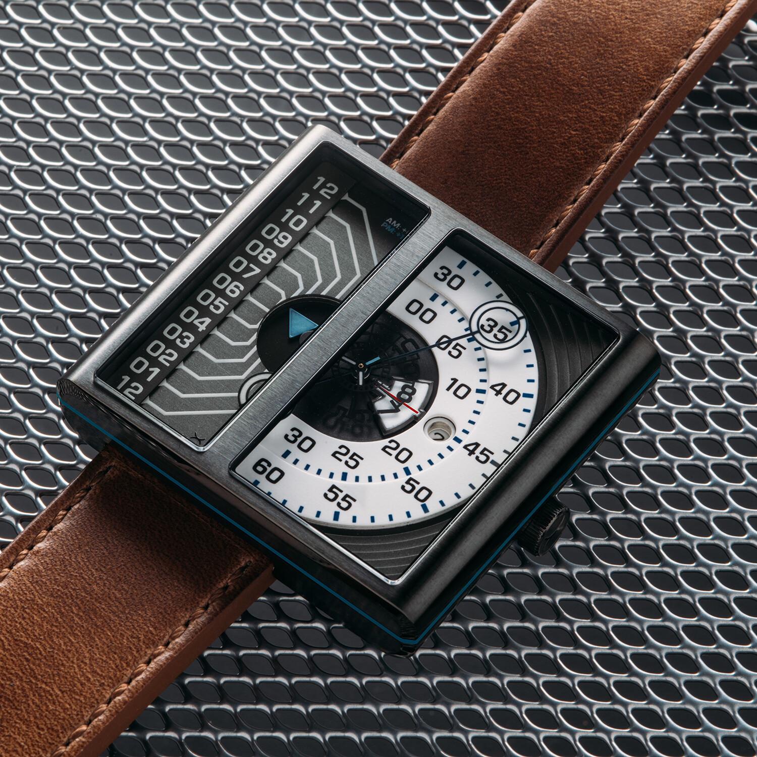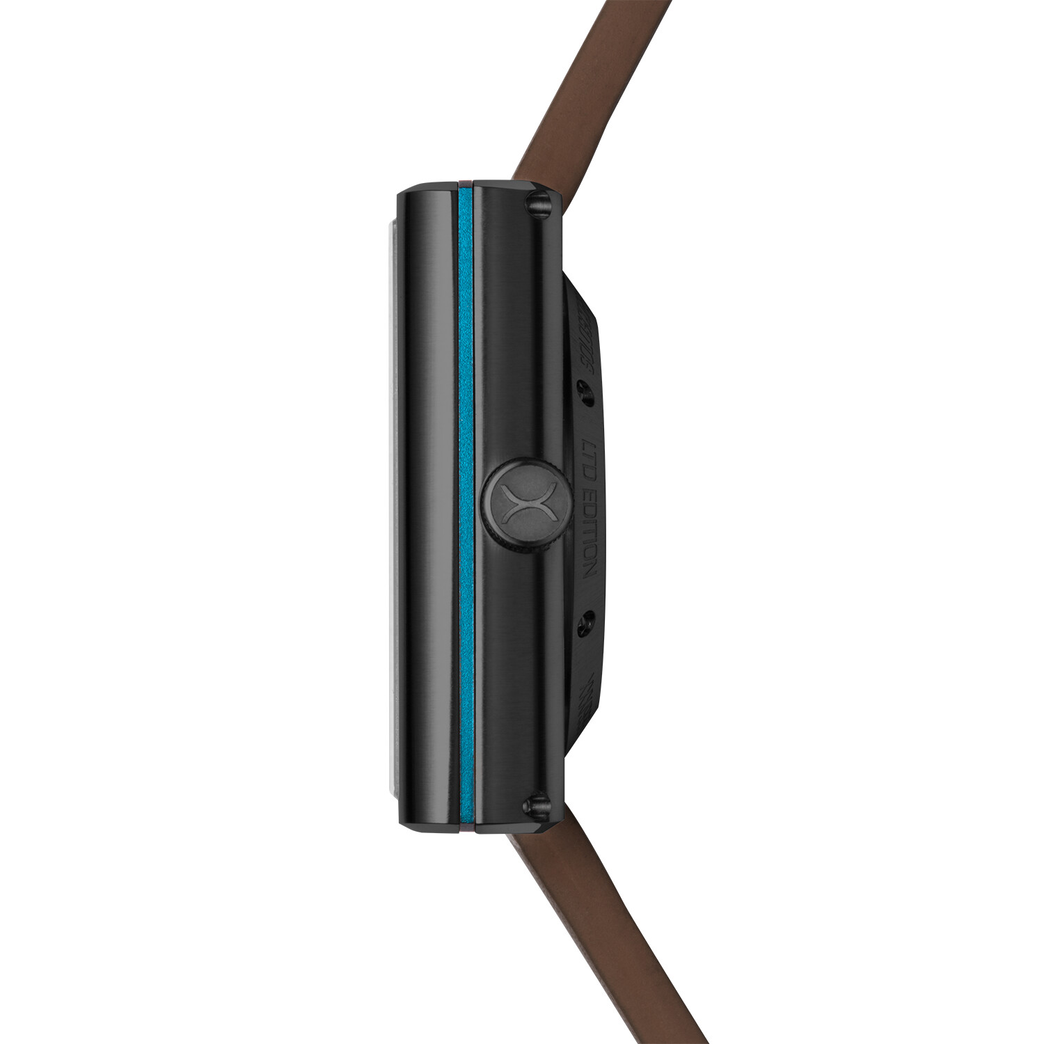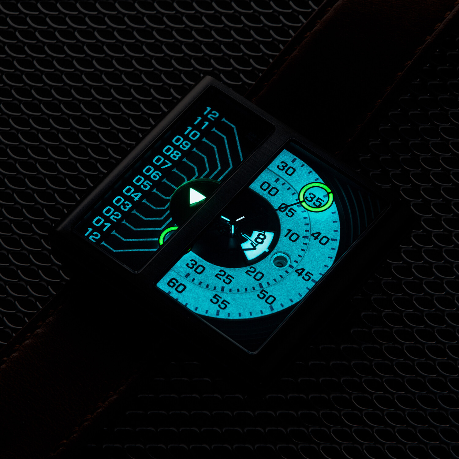 The Soloscope II Automatic has been completely redesigned and upgraded from the original. Powered by the venerable Miyota 8217 automatic movement with date function, a 40 hour power reserve, and a custom-designed rotor that can be seen through the case back. A skeletonized hour hand comes into view as it rotates over a luminous background while the halo hand encircles the minutes. The left-hand side of the watch is an AM/PM indicator and can alternatively be used to read the hours. The new case design features a slimmer profile with a colorful anodized aluminum ring, integrated lugs, and anti-reflective sapphire glass.