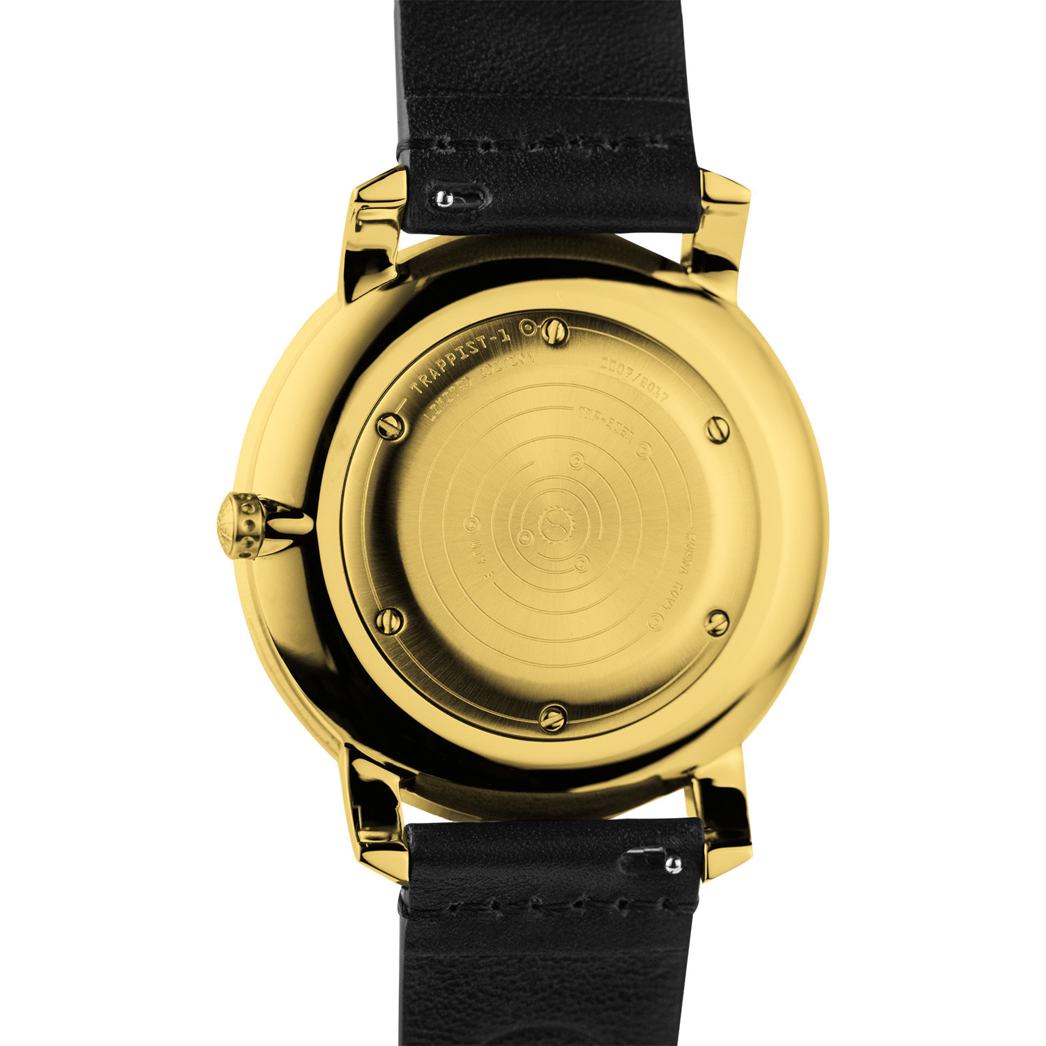 Several key features of the Trappist-1 Moonphase watch set it apart from other traditional watch designs. The large Cupola grille floating over the dial provides a window into the depths of space and time as distant planets slowly come into view amongst the star riddled void. Two Super-LumiNova™ planets indicate hours and minutes on the dial, and the center viewing window shows the current moon phase. The watch features a domed crystal made from Hesalite, a material that was initially developed for NASA. Hesalite is still used for watch crystals on all space missions due to its rigidity and durability even in the harshest environments of space. Additionally, the straps are made from U.S. Horween leather and the ridges are modeled after texturized space gloves.