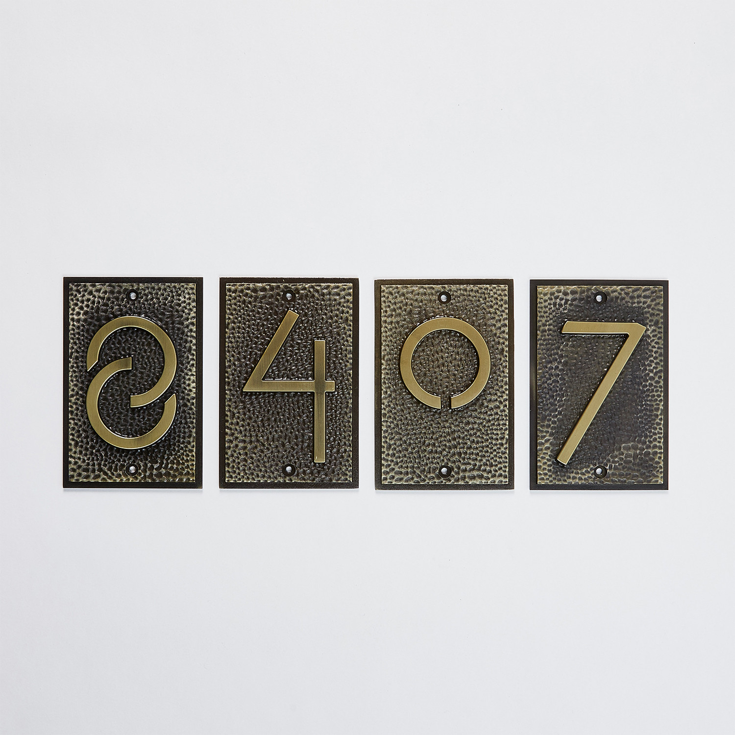 This series of signs and house numbers was adapted from the same font style created by Frank Lloyd Wright in 1931. The lettering style was created using 45 and 60 degree slanted lines and two compass curves.