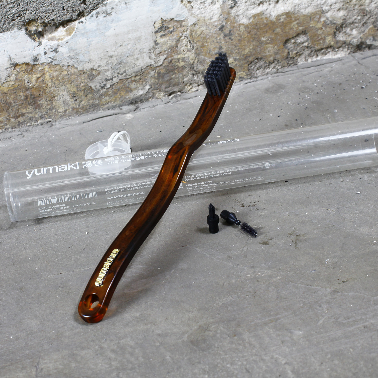 The Furui Kame toothbrush has a faux tortoise handle that's made of PETG plastic and bamboo charcoal blended nylon bristles. Each toothbrush has a unique handle.