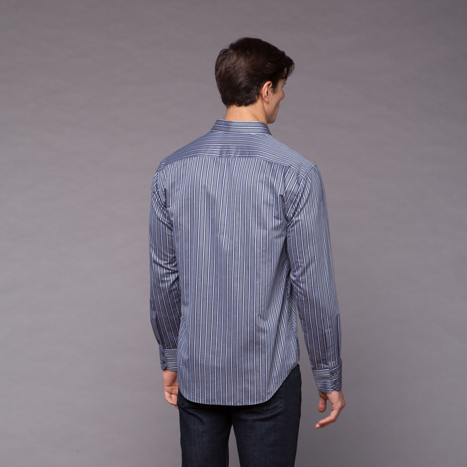 This Rockwell Shirt by Zachary Prell features long sleeves, a double barrel cuff, signature sleeve-placket stitching, and a navy, grey and silver stripe. Incredibly well made, with a perfect fit, its modern makes it super versatile.