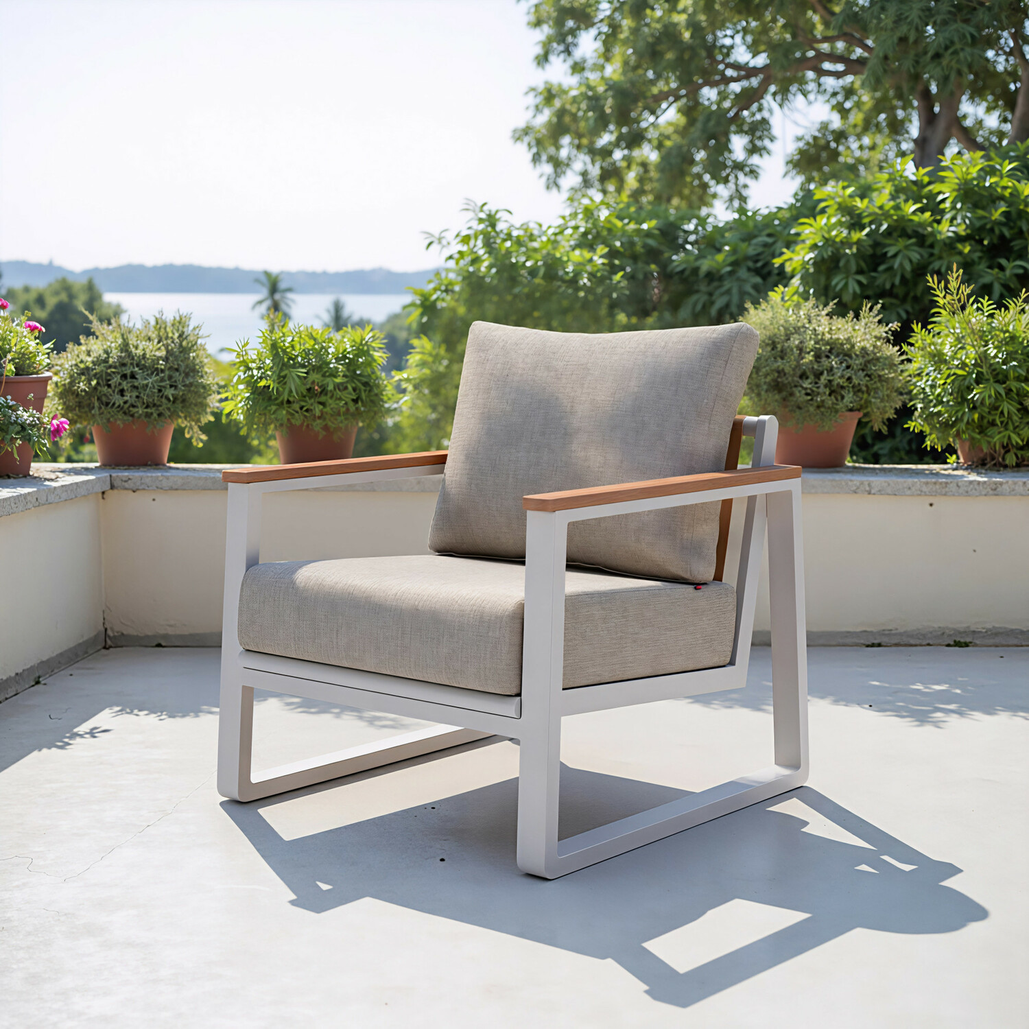 Enhance your outdoor living area with the Welt Armchair Taupe & White, a stunning showcase of modern design. Crafted from durable Olefin and aluminum, this armchair perfectly balances style and functionality, making it an ideal choice for patios, decks, or gardens. Its sleek and contemporary design ensures it stands out while seamlessly complementing any outdoor setting.