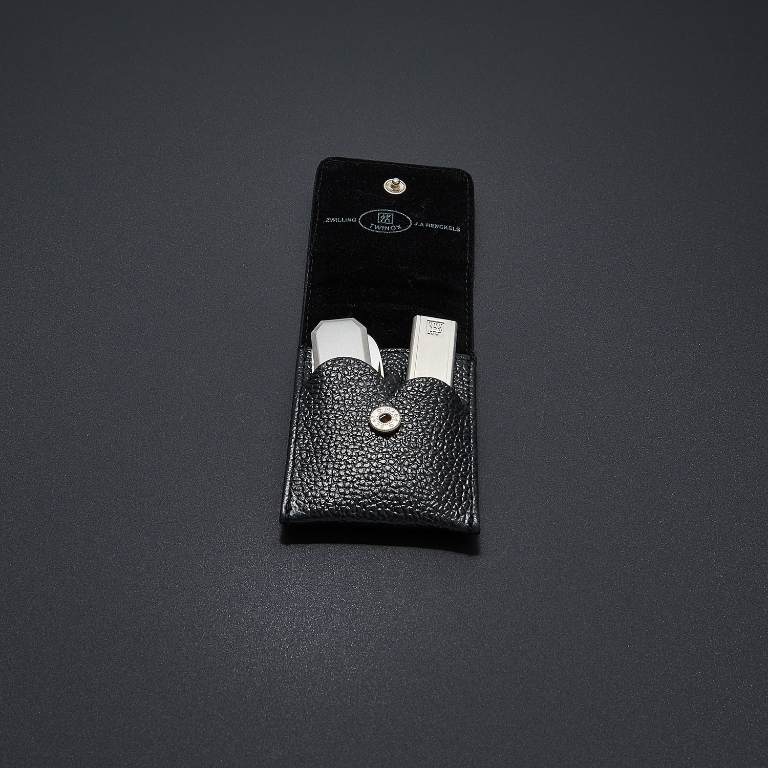 Perfect for travel, this Two Piece Luxury Grooming Kit consists of essential, quality, and precision tools beautifully packaged in an elegant, black leather case. The slim line nail clipper has sharp cutting blades and folds flat for easy storage. The convenient stainless steel utility knife features a nail file and cleaner.